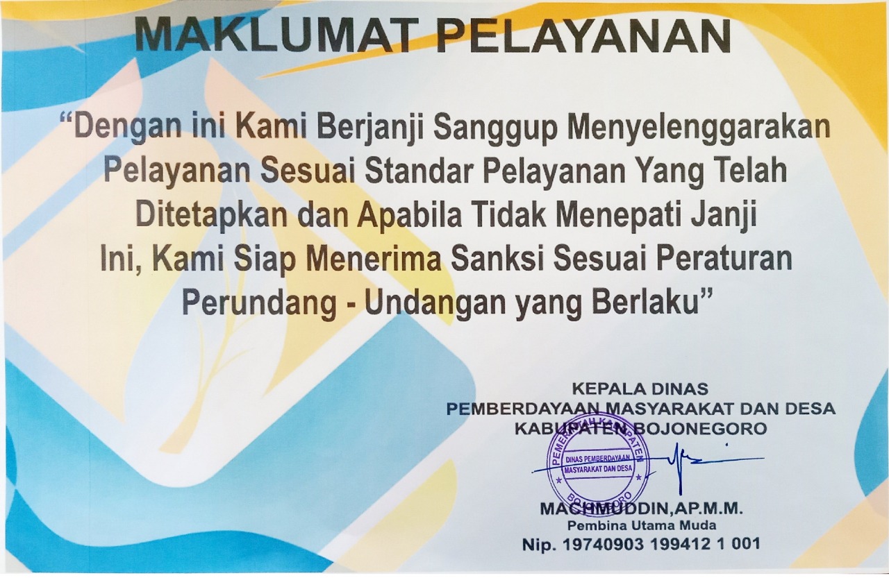 Dinas Pemberdayaan Masyarakat dan Desa Kabupaten Bojonegoro berkomitmen menyelenggarakan pelayanan sesuai dengan standar pelayanan yang telah ditetapkan dan apabila tidak menepati komitmen ini, kami siap menerima sanksi sesuai peraturan perundang-undangan yang berlaku.